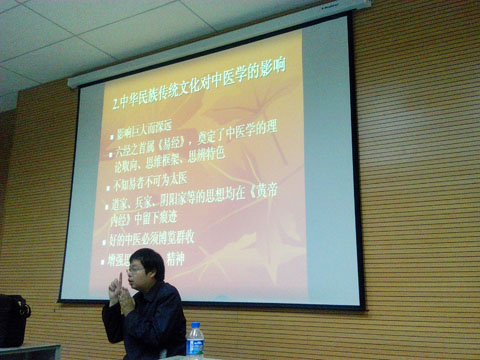 丰富广大学生的生活,开拓学生的视野,增长学生的知识,一学期来,医学系坚持每周安排具有副教授以上职称或硕士研究生学历的教师为学生开展学术讲座。交流内容丰富,知识面广,形式多样,具有很强的指导性和适用性。6月12日晚19:30,我系潘立文博士就《中国传统文化与中医学的关系》与同学们进行讲座探讨,吸引了众多志同道合的同学,甚至有检验系的部分学生专程慕名而来聆听此次讲座。讲座中,潘博士指导同学们应该以辩证的态度看待中国传统文化,而不可盲目信仰,做到取其精华、去其糟粕,并以“根氐在黄老之道,发扬自孔孟之儒,受惠于释迦之佛”为主线展开,讲解中国传统文化是儒、道、释三种流派思想长期融合而来的,三位一体,不可分割。让同学们在了解中国传统文化的背景下进而引入其与中医学的内在联系,他指出中医学直接脱胎于中国传统文化,是滥觞于中华民族优秀文化的一朵奇葩,二者唇齿相依,这是中医的一大特色,在世界文化史上独树一帜。潘博士以其渊博的学识、流利的口才、丰富的肢体语言向同学们诠释中国传统文化与中医学之间关系,展现了其独特的个人魅力和独道的见解,折服了在场的每一位同学,现场激烈而持久的掌声为这场精彩的讲座画上了圆满的句号。
