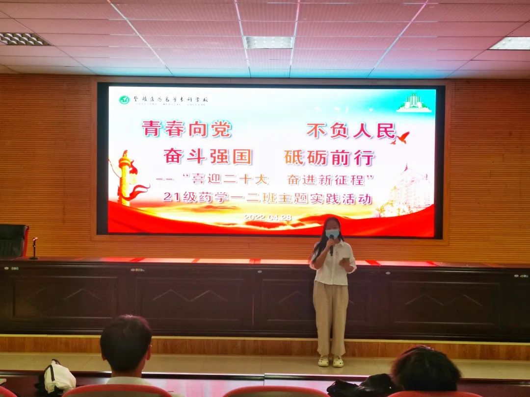 赓续青春百年志,踔厉奋发向未来。2022年是党的二十大召开之年,也是中国共产主义青年团建团100周年,为积极引导学校广大团员青年砥砺奋进、筑梦前行,4月28日,药学系2021级药学一、二班班主任张嘉峻老师组织带领两个班79名同学,在校史馆报告厅开展了“青春向党、不负人民、奋斗强国、砥砺前行”班级主题教育实践活动,依托学校红色教育资源,采用“1+1+1”三线实践模式,突出仪式教育的感召作用,使79名同学在庄严肃穆的仪式中接受“沉浸式”的精神洗礼。